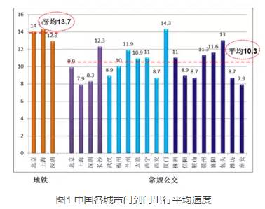 中国各大城市交通综合调查数据显示(图1),北京公交“门到门”平均速度为9.9km/h(平均值为10.3km/h),还不如普通自行车出行效率。以北京亦庄到方庄为例,模拟早高峰上班出行(轨道交通、地面公交、公共自行车、步行混合出行),出行者在“换乘等候”和“最后一公里”损耗的时间占到了总时间的54%,公共交通“门到门”出行效率极低。