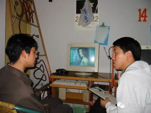 2002年5月本人(右)在四川西昌采访网吧网管。这位年轻的网管已是下岗职工。当地正在打击网吧,所以招牌放到了屋内。